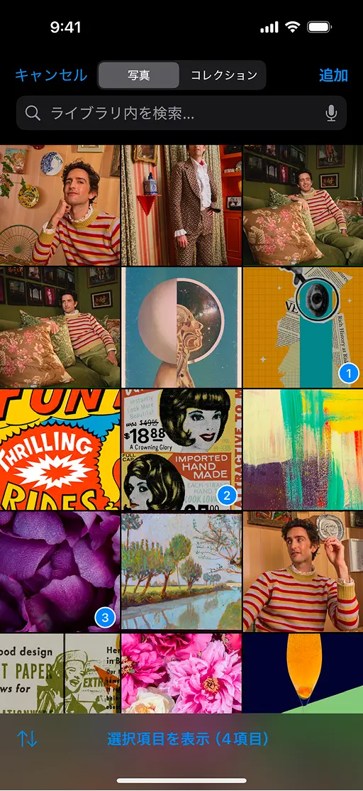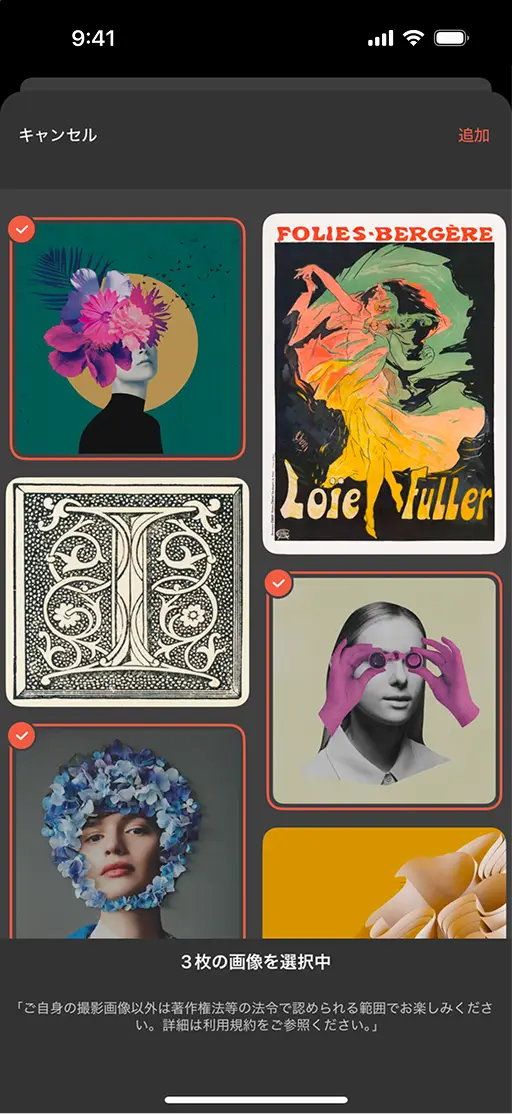 右上の+マークをタップし、「スマートフォンから画像追加」を選択。