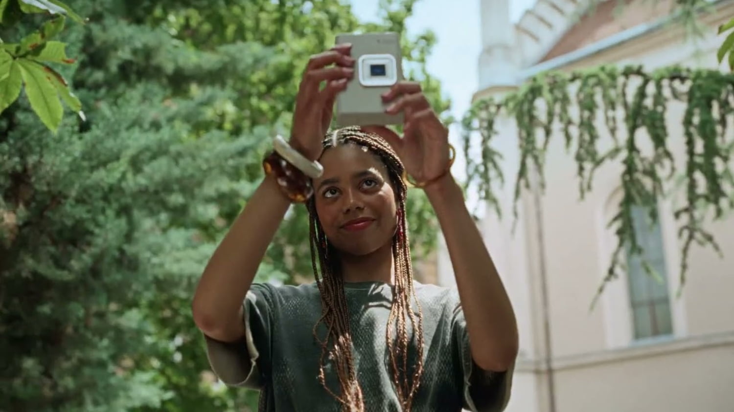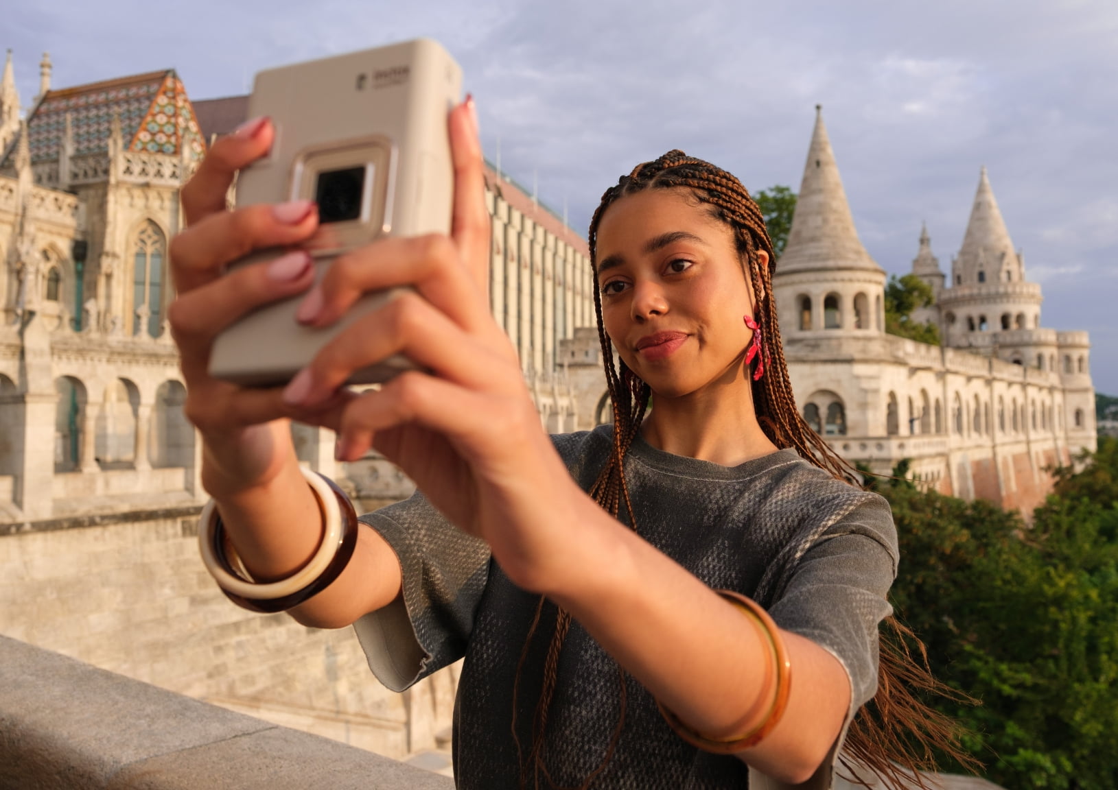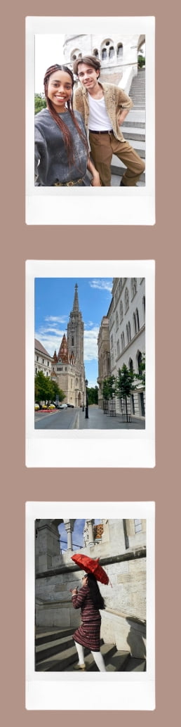 セルフィーを撮影しながら、景色を背景画像として一緒に残すことで、チェキプリント™1枚に思い出を詰め込めます。選べるレイアウトは全4種。