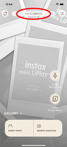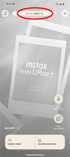 スマートフォンアプリ「instax mini LiPlay™」を起動して[カメラに接続する]を選択してください。