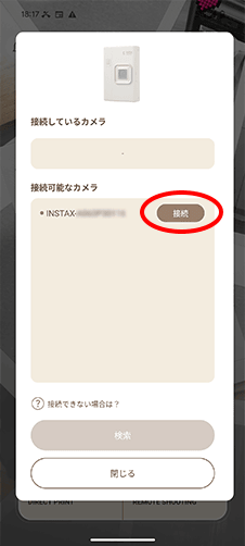 - 8) アプリのBluetooth設定画面に接続可能なカメラが表示されたら、接続ボタンをおしてください。