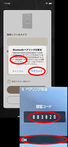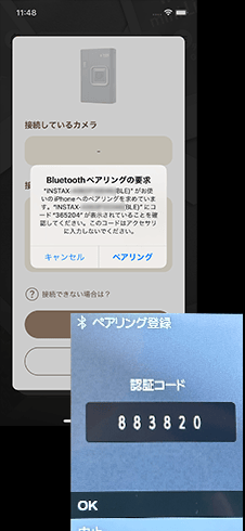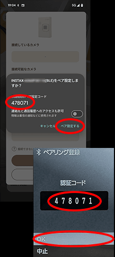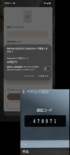 - 9) アプリにBluetooth接続のペアリングの要求が表示されたら、画面に表示されている認証コードと、「instax mini LiPlay+™」の本体の画面に表示されているコードが同じであることを確認し、ペアリングまたはペア設定するを押してください。