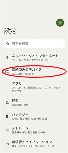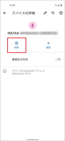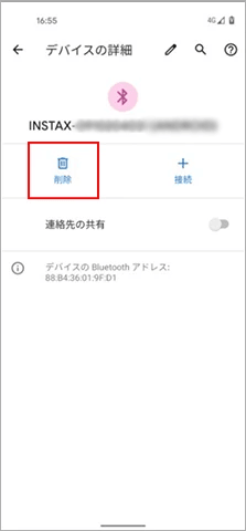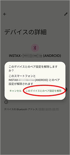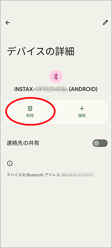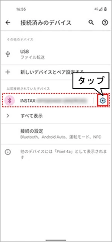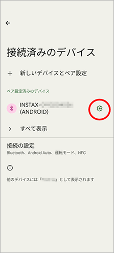 接続済みデバイスに「INSTAX-XXXXXX(ANDROID)」がある場合、該当デバイスの(歯車)マークをタップしてください。