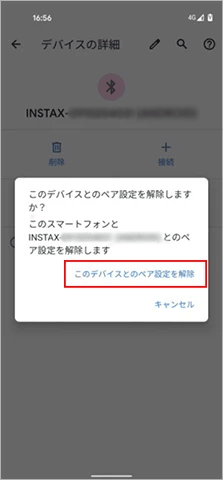 「instax mini LiPlay+™」本体の撮影メニューからBluetooth設定を選び、メニューの「ペアリング削除」を選択し、ペアリングを解除してください。 -